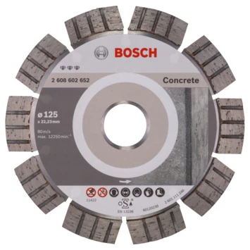 Diamantdoorslijpschijf Best for Concrete 125 x 22,23 x 2,2 x 12 mm. Ideaal voor alle uitgeharde betonsoorten en gewapend beton. Uitstekende snijsnelheid dankzij de Speed Stripes voor minder wrijving aan de zijkant. Tot 15 mm segmenthoogte voor lange levensduur, zelfs in veeleisende materialen.