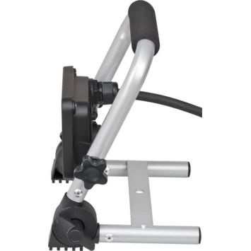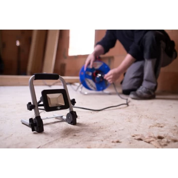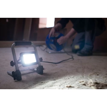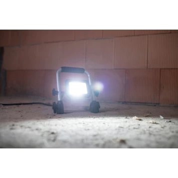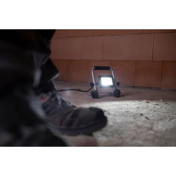 Mobiele LED- werklampEL 750 M, 9,9W, 900lm, IP65, 1,5m H07RN-F3G1,0 Voor gebruik binnen- en buitenshuis, IP 65. Solide, moderne aluminium behuizing. Ruimtebesparend door opvouwbaar frame. Stevig stalen buizenframe met kunststof beschermhoeken en ergonomisch gevormde schuimrubberen draaggreep. Spotlight traploos draaibaar en vergrendelbaar.