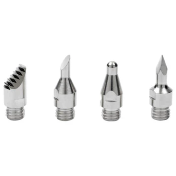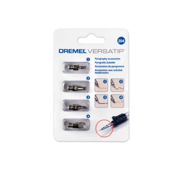 Dremel pyrografie-accessoires worden gebruikt voor het aanbrengen van pyrografiemotieven op hout en leer. De set bevat vier tips: kogelvormige punt, ovaal, scherpe punt en patroon. Gescihkt voor de Dremel VersaTip.