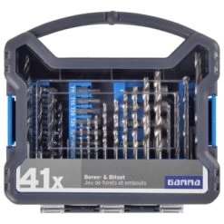 De Gamma boren -en bitset is een uitgebreide set bestaande uit 41 boren en bits, variërend in maat en soort. De set bestaat uit Metaalboren: 1 – 1,5 – 2 – 2,5 – 3 – 3,5 – 4 – 4,5 – 5 – 6 – 6,5mm, Betonboren: 4 – 5 – 6 – 8 mm, Houtspiraalboren: 3 – 5 – 6 – 8mm, Schroefbitsets 25mm (S2) PH – PZ – SL – TX, Dopsleutelbits M6 – 8 – 10 – 12, Magnetische bithouder en een verzinkboor.