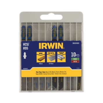 Irwin decoupeerzaagset IW1014503 is een 10-delige set met een mix van hout-/ en metaalzagen. De cassette bevat 7 houtzagen en 3 metaalzagen met diverse vertandingen voor een fijne tot grove afwerking. De decoupeerzaagbladen hebben een T-aansluiting. De zaagbladen passen ook op de nieuwste generatie decoupeerzagen die een universele aansluiting hebben.