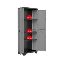 De Kis kunststof kast, Stilo, hoog is een ideale opberger voor diverse spullen. De hoge, lichtgewicht opbergkast is voorzien van twee vleugeldeuren en is vormgegeven in een strak design. De kast past dan ook in iedere ruimte, of het nu in huis, de schuur, de garage of op de werkplaats is. De kast zet u gemakkelijk in elkaar en de legborden zijn in hoogte verstelbaar. Zo kunt u de kast naar eigen wens indelen en gebruiken voor diverse spullen, zoals schoonmaakmiddelen, verfblikken, gereedschap, speelgoed, enz. Bovendien is de kast compact verpakt, zodat u deze eenvoudig kunt vervoeren. Kortom, met de Kis kunststof kast creëert u gemakkelijk extra opbergruimte.