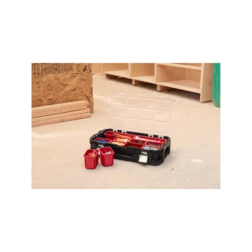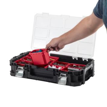 Deze organizer is een handig opbergsysteem met 8 kleine en 2 uitneembare verdeelbakken. Dankzij de extra sterke polycarbonaat deksel blijven alle spullen veilig opgeborgen. Het stevige handvat zorgt ervoor dat je de organizer gemakkelijk mee kunt nemen en de duurzame metalen sluitingen zorgen voor een optimale bescherming. De Organizer Keter Connect past op het Connect Trolley Systeem en het Connect Rolling Systeem met behulp van de in elkaar klikkende sluitingen. Zo kun je zelf je ideale opberger samenstellen. Kortom, de perfecte opberger voor zowel professionals als enthousiaste doe-het-zelvers.