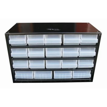 De Raaco Metalen Ladenkast met 19 laden (C4-19) is een stevige, metalen ladekast waarmee u in een handomdraai extra opbergruimte creëert. De kast wordt geleverd met 19 lades in 2 formaten, zodat u zowel grote als kleine spullen gemakkelijk en overzichtelijk op kunt bergen. De lades zijn geschikt voor vrijwel alle soorten spullen, zoals bijvoorbeeld gereedschap, schoonmaakmiddelen, tuinartikelen en accessoires. Dankzij het lage model kunt u ook spullen bovenop de kast plaatsen. Dit opbergsysteem is gemaakt van sterk materiaal (kunststof polypropyleen), wat een lange levensduur heeft. Kortom, met de Raaco ladenkast creëert u snel meer ruimte en vindt u voortaan uw spullen gemakkelijk terug!