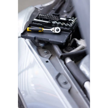 STANLEY COMPACT 37-delige dopsleutelset STMT82672-0 bevat een 1/4″ ratel met 72 tanden, waardoor je snel en nauwkeurig kunt sleutelen. De inhoud is zeer gevarieerd, zodat je bijna alle voorkomende sleutel- en schroefklussen in en rondom huis kunt klaren. Inhoud: 10 x doppen met 1/4″ aansluiting (5,5 t/m 14mm), 1 verlengstuk 4″, 1 bitschroevendraaier met 20 bits (Pozidriv PZ1, PZ2, PZ3. Phillips PH1, PH2, PH3. HEX 3, 4, 5, 6, 7. Slotted 4, 5, 6, 7. Torx TT10, TT15, TT20, TT25, TT27 , TT30 and TT40 ). Alles is opgeborgen in een overzichtelijke cassette, zodat je snel vindt wat je nodig hebt en meteen ziet als er iets ontbreekt.