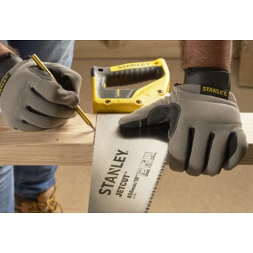 Stanley handzaag 2-15-283 is een universele zaag uit de JetCut serie. Met een gehard en getemperd zaagblad voor meer duurzaamheid en hoge prestaties. De bimateriale ergonomische handgreep met uitsparing voor je wijsvinger zorgt voor optimaal comfort en controle. De handgreep is bovendien voorzien van aftekenhoeken van 45° en 90°. Elke zaagtand is voorzien van 3 snijvlakken, zodat je ook in achterwaarte beweging hout wegneemt. Hierdoor zaag je veel sneller. De zaag heeft een lengte van 450mm en een vertanding van 7TPI (7 tanden per inch). Dit geeft een wat ruwere afwerking, maar maakt de zaag wel sneller. Het zaagblad heeft een dikte van 1mm en is daardoor lekker stevig.